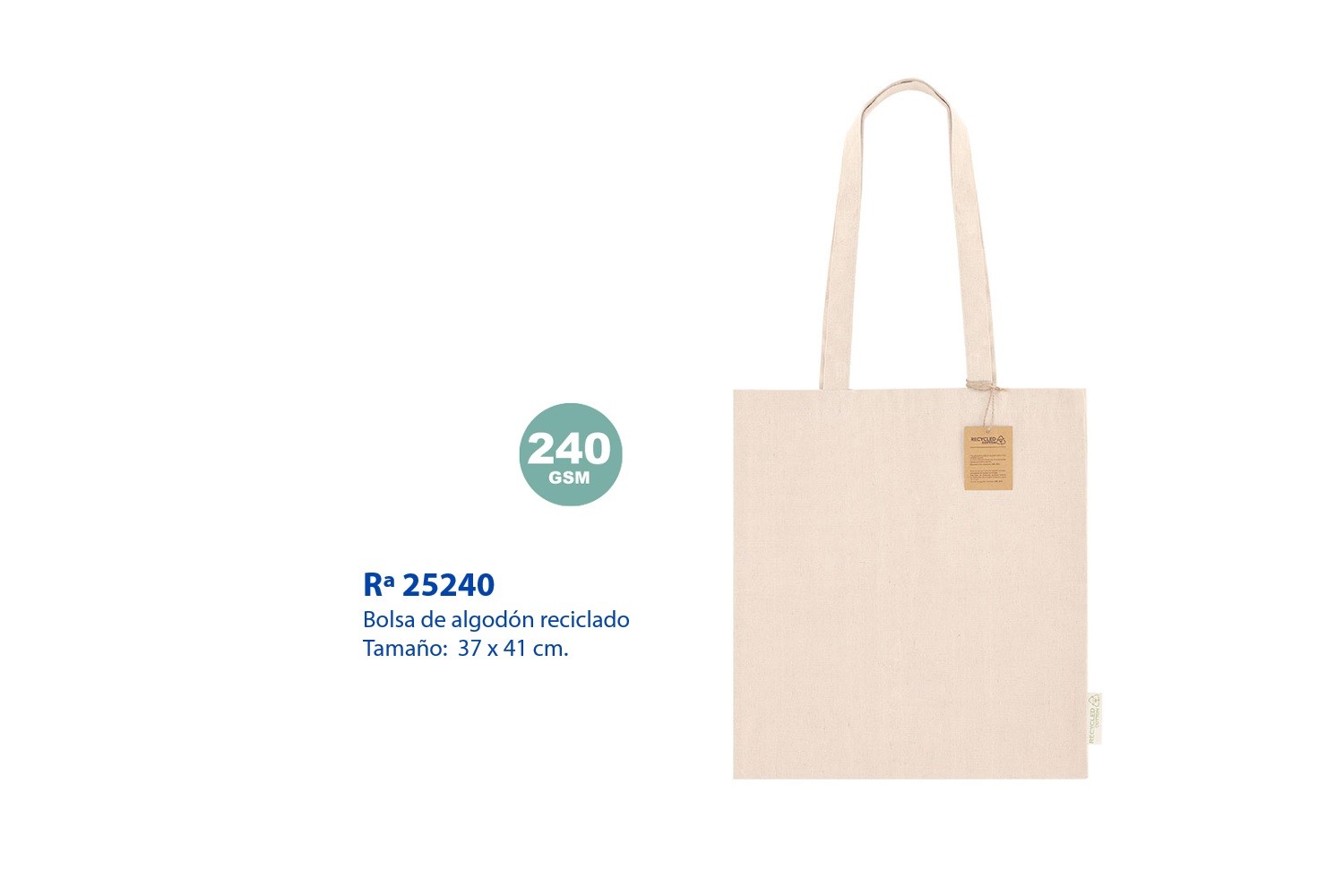 Bolsa de algodón reciclado de 240 gr.Asas largas de 70cm con refuerzo (acabado cosido). Resistencia hasta 7 kg.