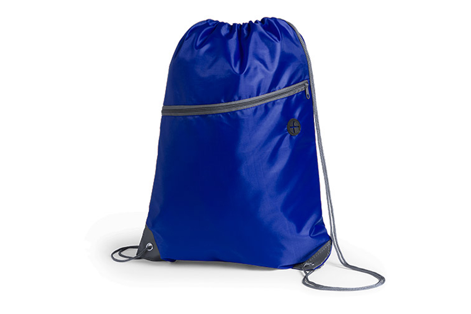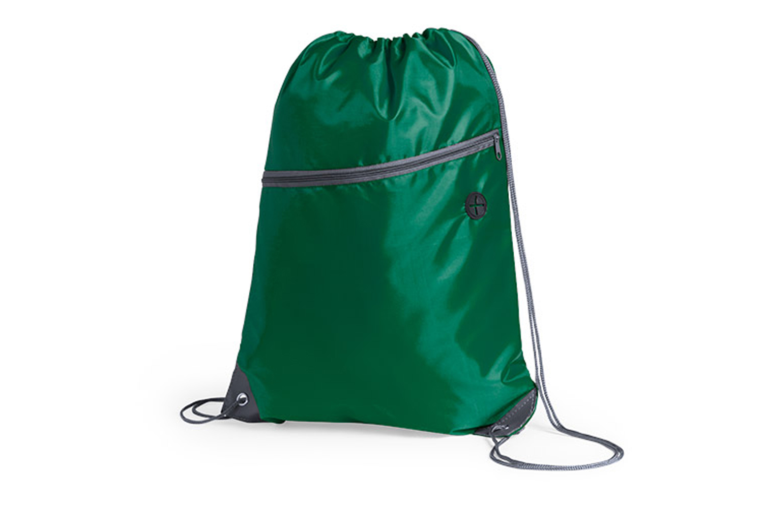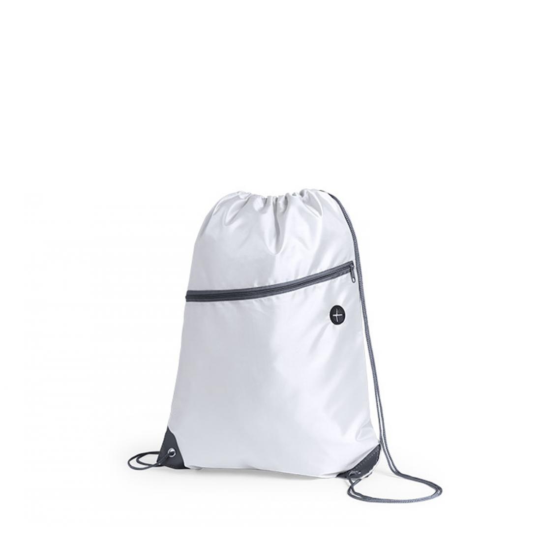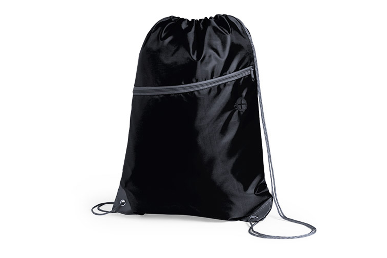 Bolsa mochila de poliéster 210D con cuerdas autocierre. Bolsillo frontal con salida de auriculares. Esquinas reforzadas con argolla metálica.