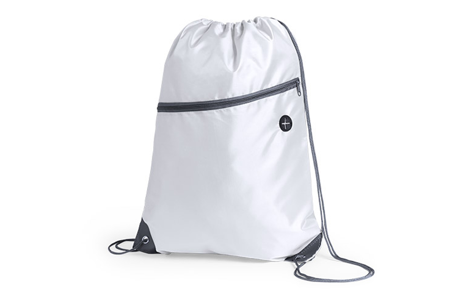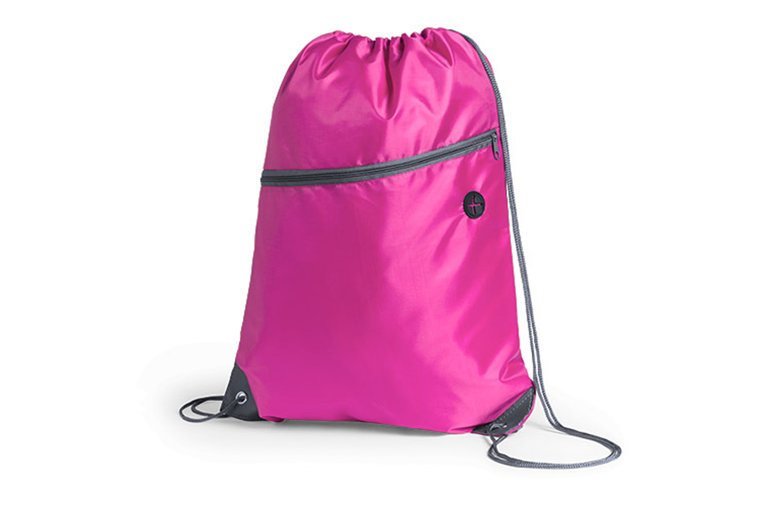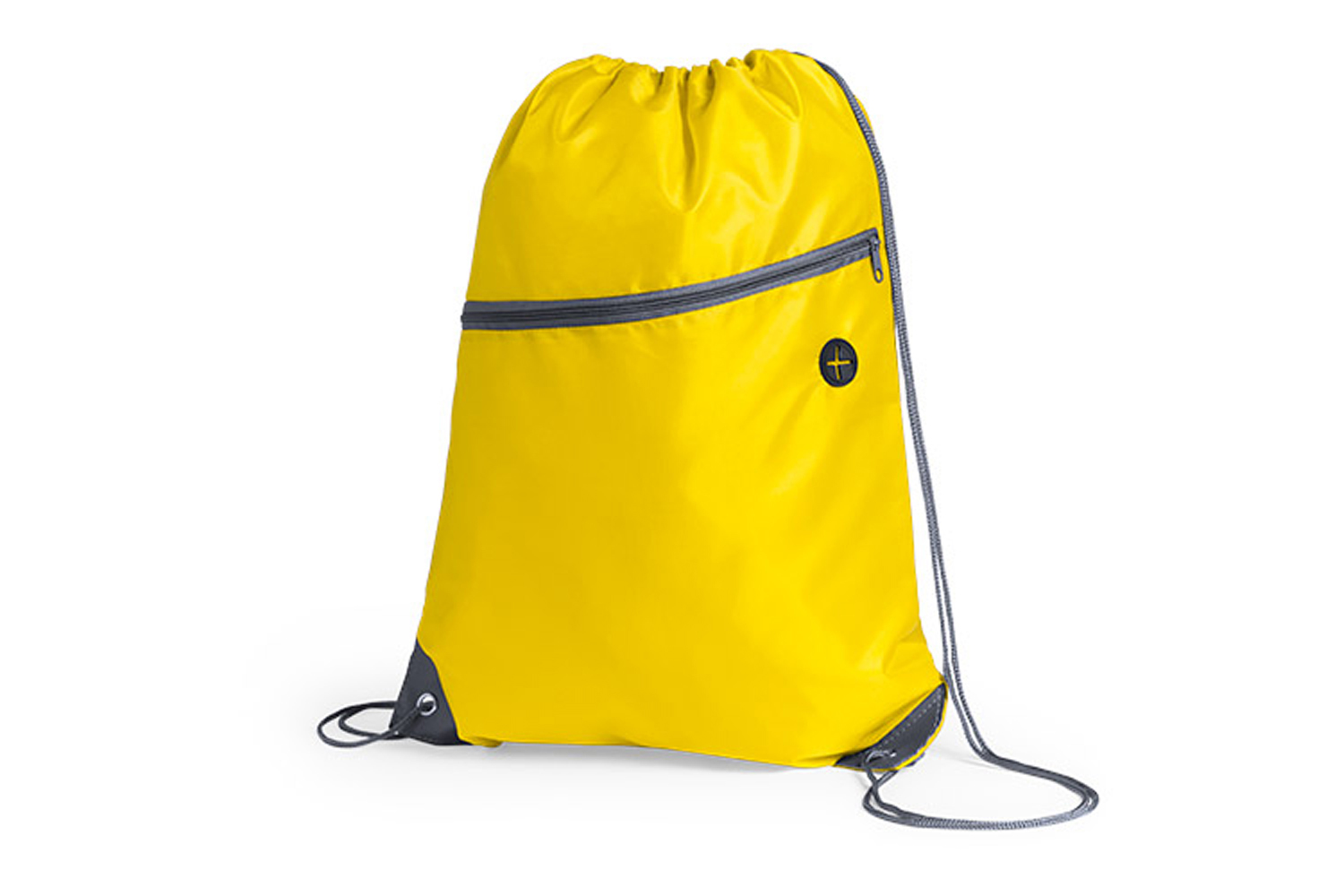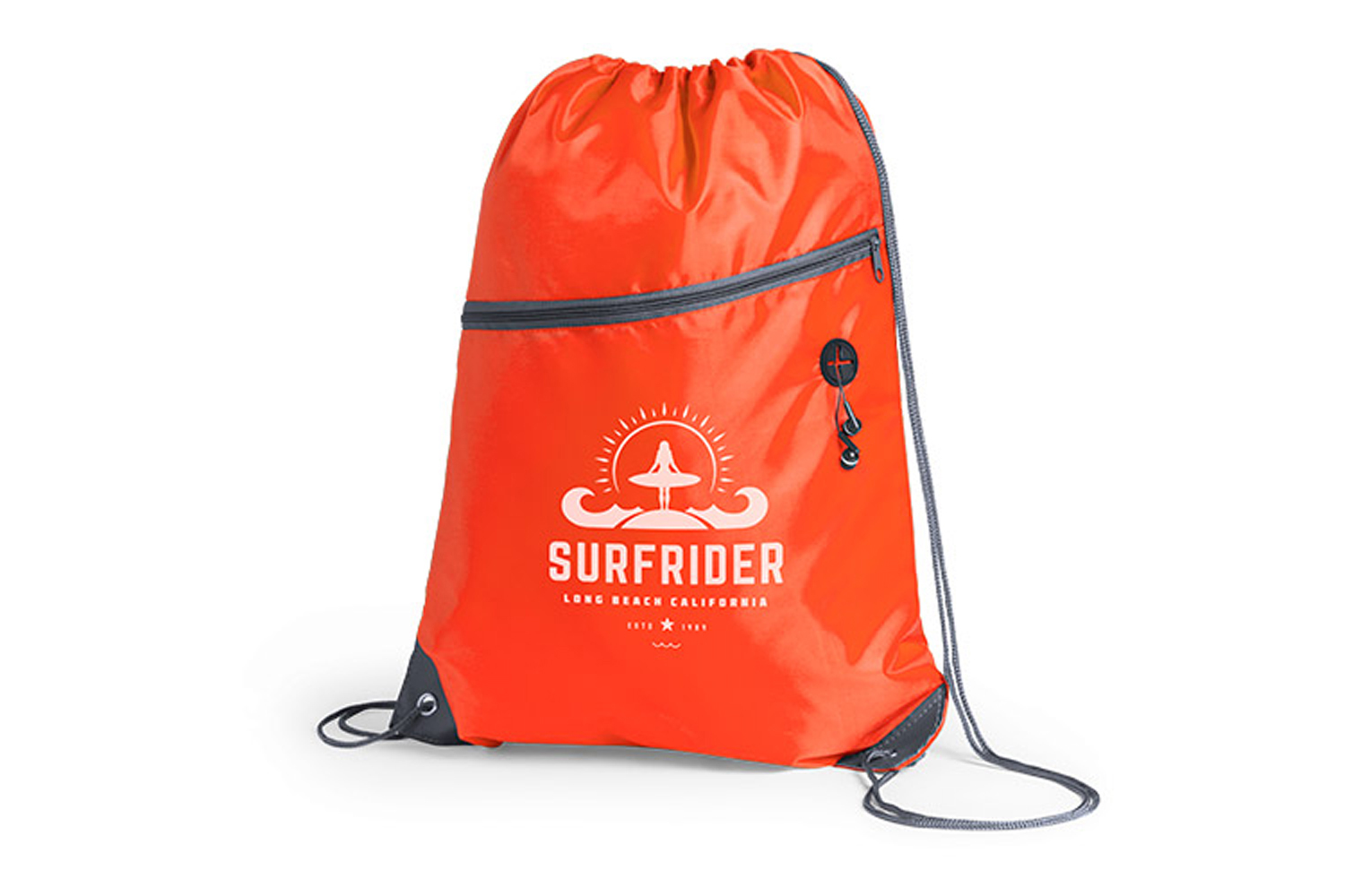 Bolsa mochila de poliéster 210D con cuerdas autocierre. Bolsillo frontal con salida de auriculares. Esquinas reforzadas con argolla metálica.