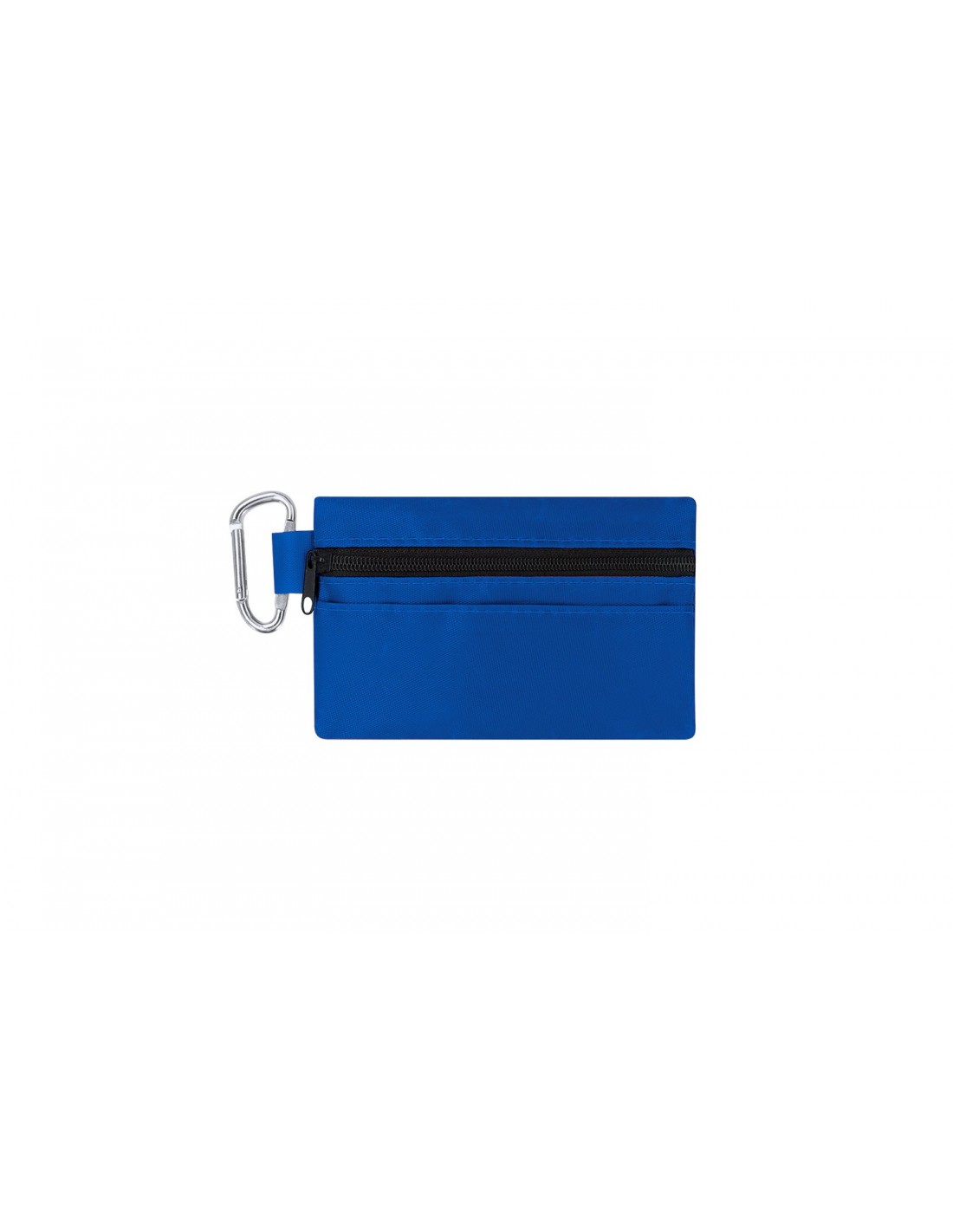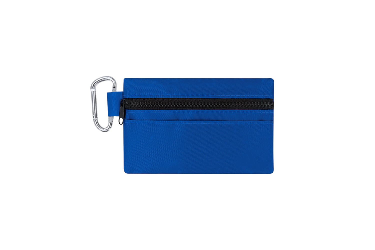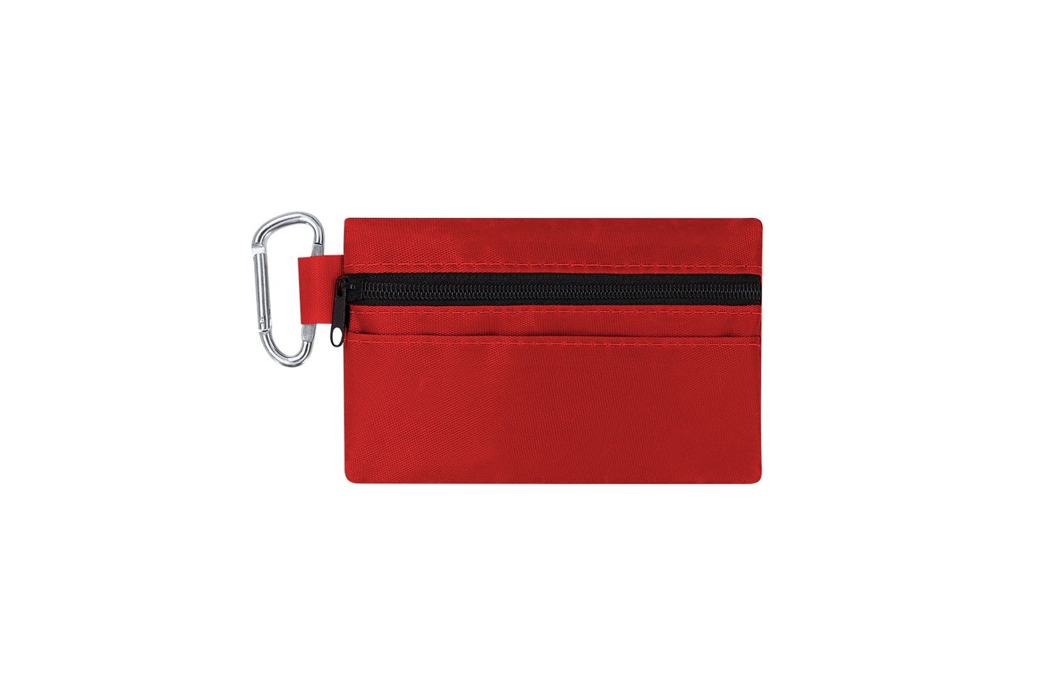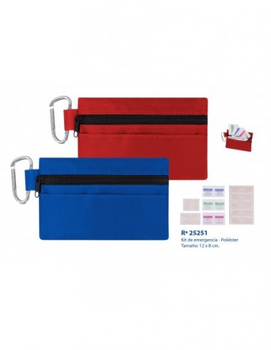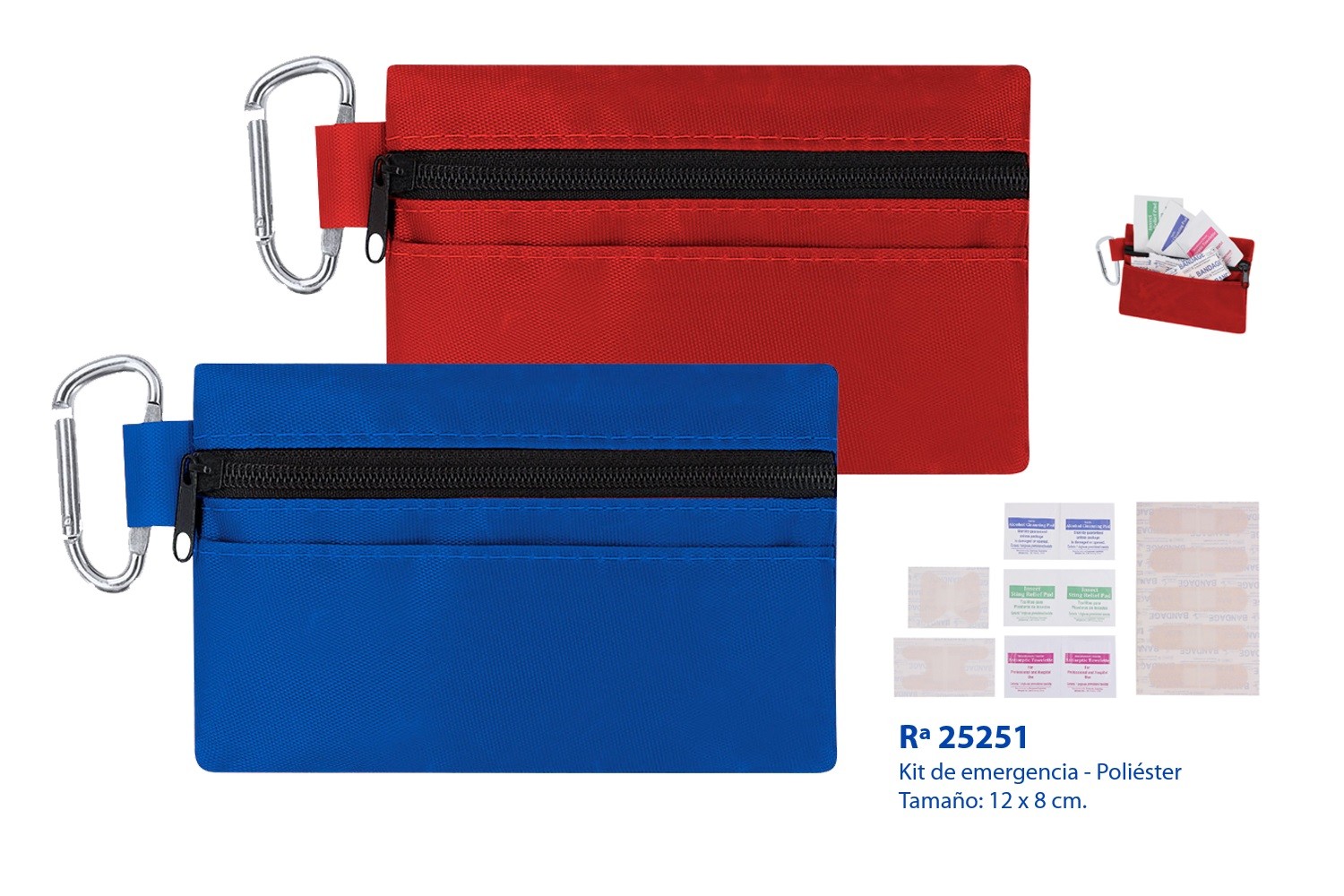 Kit de emergencia con estuche de poliéster 600D, cierre de cremallera, bolsillo frontal y mosquetón metálico. Incluye vendas, toallitas, toallas con alcohol y toallita alivia picaduras.