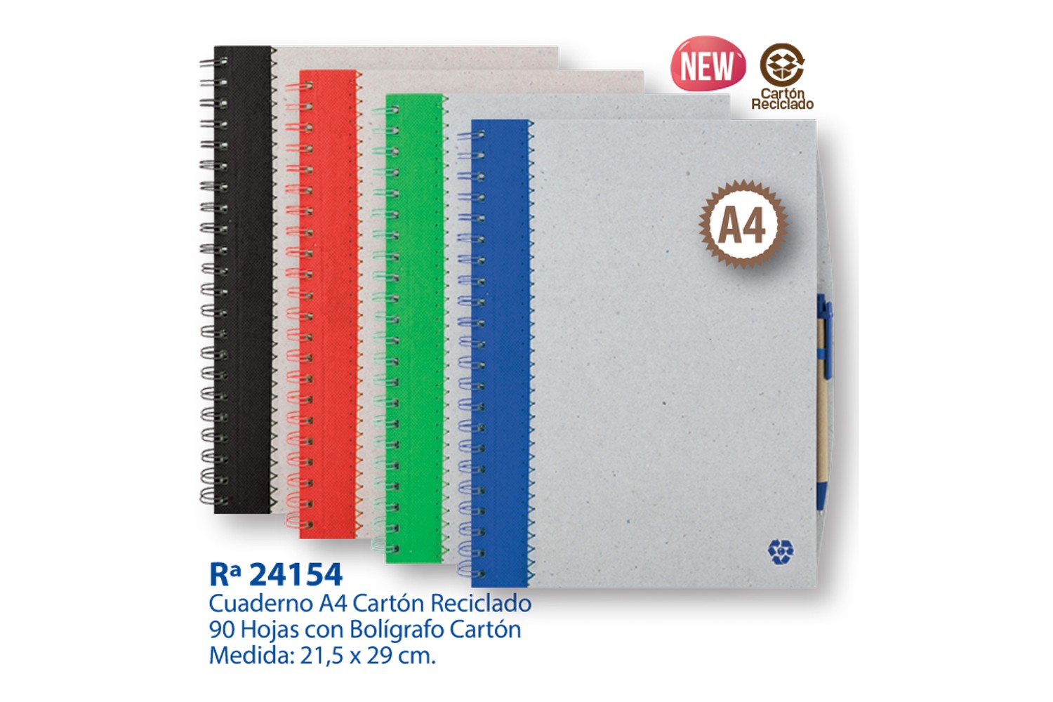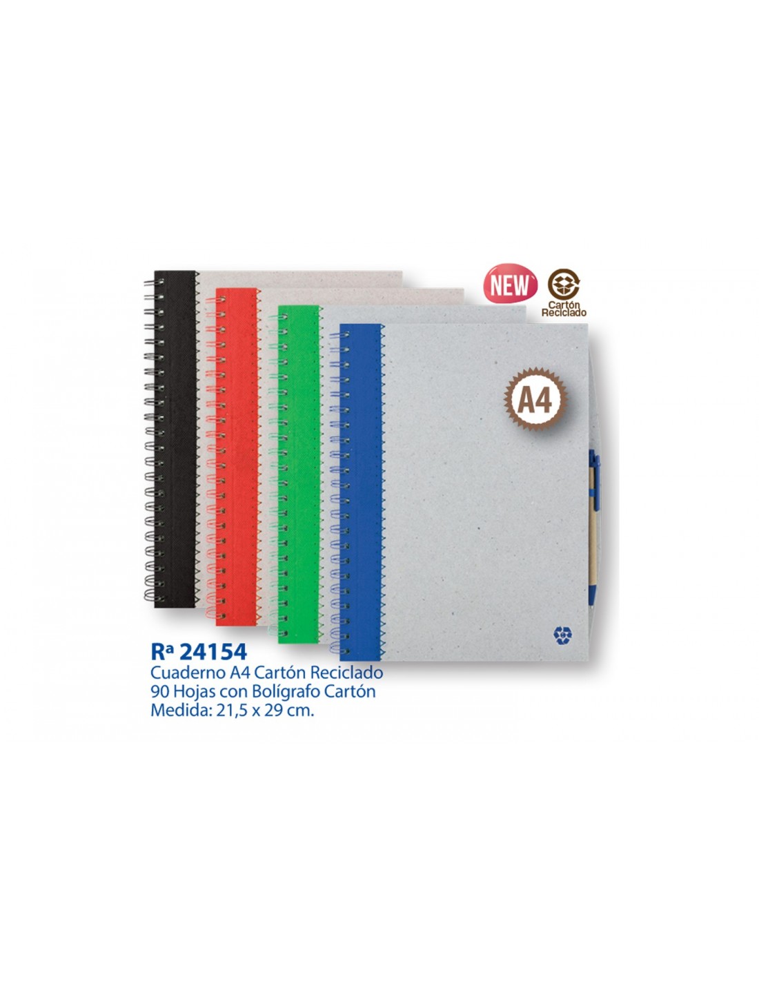 Cuaderno A4 de cartón reciclado con 90 hojas y bolígrafo a juego.