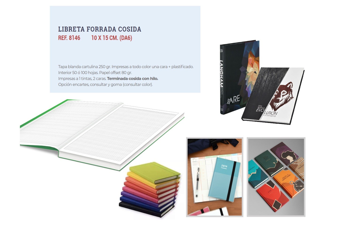 Libreta con tapas de cartulina de 350 gr.Impresas a todo color por 1 cara + plastificado.Goma incluída. (consultar color)Terminada cosida con hilo.Opción encartes, consultar.Interior:100 hojas de papel offset de 80 gr.Impresas a 1 tinta por las 2 caras.Tamaño: 10 x 15 cm.