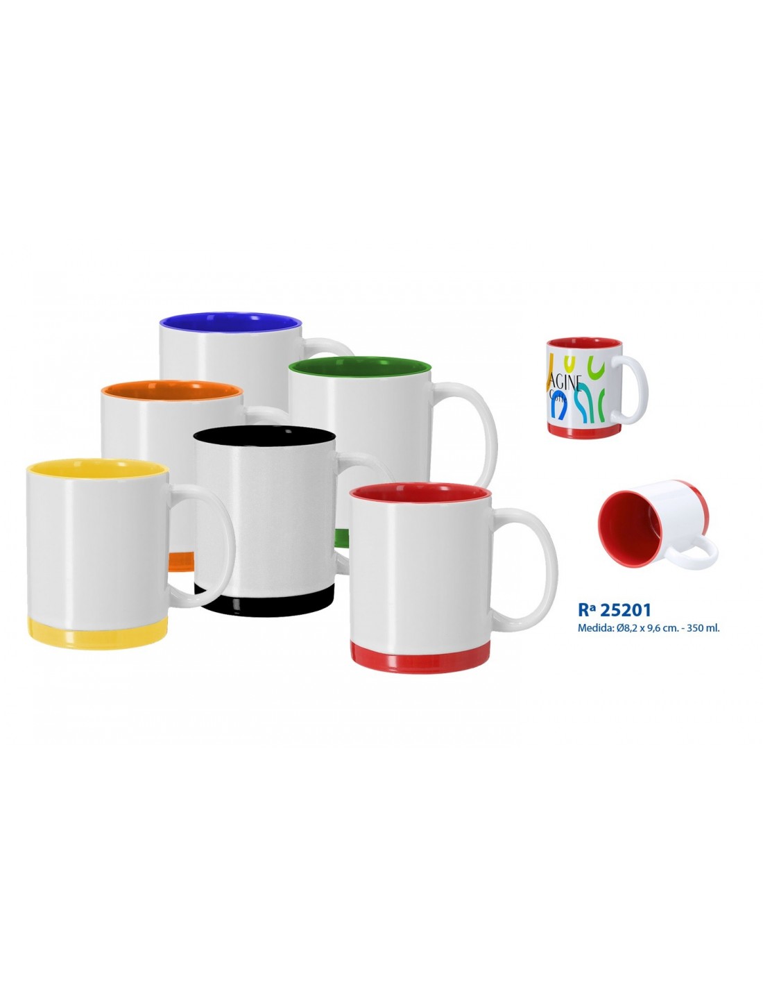Taza de cerámica para sublimación - 350 ml.Exterior blanco y base e interior de color.